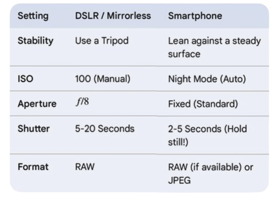 * ISO: Keep this as low as possible (usually ISO 100 or 200). High ISOs can make your photos look "grainy," especially in those dark blue sky gradients.